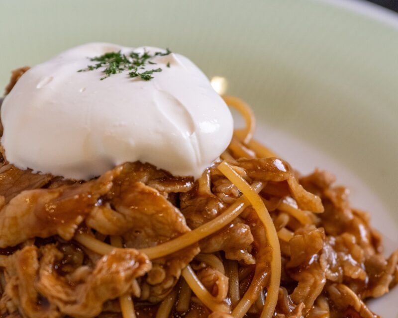 芳醇なデミグラスソースと濃厚な生クリームのコクが牛肉の旨味を引き立てます。
