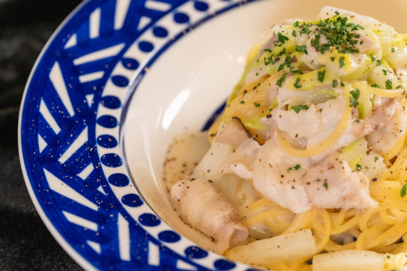 旬の白菜と豚肉の優しい甘みにクリーミーなミルクの風味と仕上げの黒胡椒が相性抜群です。